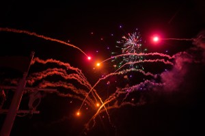 As with most Disney fireworks shows it’s not just “shoot up some fireworks and be done”, instead it begins with a stage show to help tell a story. Shortly after we arrive, Captain Jack Sparrow’s crew comes out and entertains the crowd. When Captain Jack makes his appearance, the pace quickens. Because Pirates of the Caribbean: Dead Men Tell No Tales is only a year old at this time, the synergy is still alive, so Captain Salazar and his undead crew are chasing after Jack. The pool is covered, so there is plenty of space for sword fights, zip lines, and characters flying up and down from the smokestacks. Plus with the help of the jumbo screen that is over the pool, even captain Salazar can make an appearance or two, ordering his men to find and capture Jack. Finally, as Carina Smyth informs everyone about how to get the trident, the fireworks begin overhead.