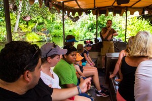 In today’s memory, we will continue our day from September 2016 as we start out in the Magic Kingdom. We are again joined today by my extended family and have just finished watching the Main Street Trolley Show and are trying to figure out where to go next. We have a late breakfast reservation at the Crystal Palace in about an hour, so we’re trying to figure out something on that side of the park that will be quick and family-friendly, and what is better than the Jungle Cruise. We’ll stroll down Main Street, make a left at the hub, and head towards Adventureland and in no time be right in front of the world-famous Jungle Cruise. We’ll join the memory as we have parked the strollers and are walking up to the entrance to the stand-by line (it’s about a 10-minute wait right now). Listen along to some of the sounds of the queue, hear the music, chuckle and groan at the announcements, and enjoy some of the puns as we work our way to the front of the line. Then it’s our turn on the boat. We have a great skipper, Skipper Emma, who will point out the amazing sights of the jungle while keeping us safe. Unfortunately, her microphone has a short in it, and it occasionally cuts out, but we will still get to hear most of her jokes and puns.