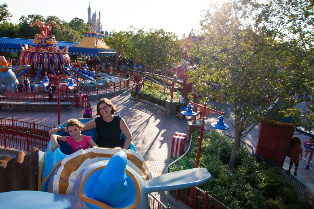 Now that you have your headphones on, let’s join my family as we take in the views of the park from the back of a flying elephant.