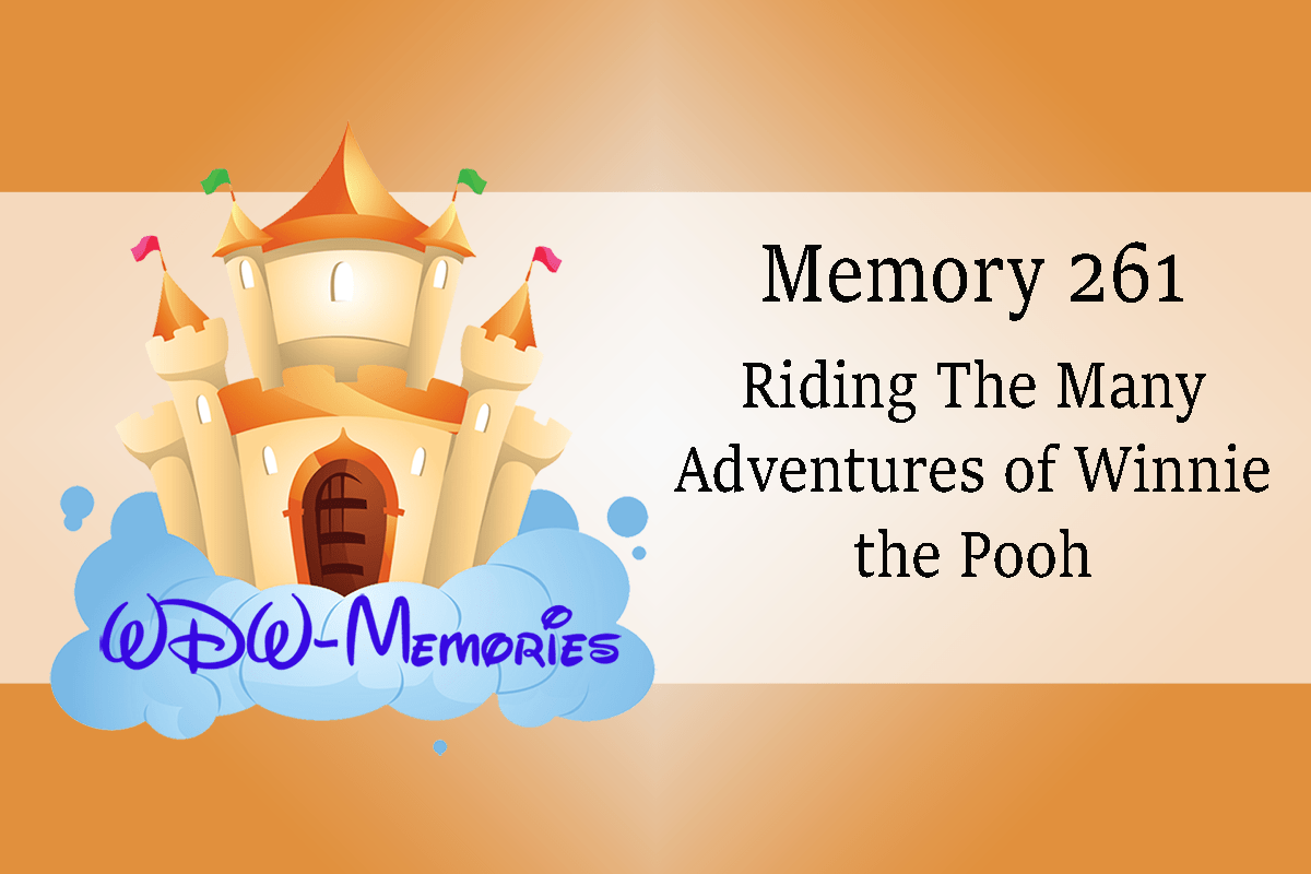 For today’s memory, we are continuing our second day in the parks on our trip in September of 2016. If you remember from Memory 260, we just finished wishes and are beginning our extra magic hour evening in the Magic Kingdom. We were on the bridge that drops us at the point where Fantasyland and Tomorrowland merge, so we can easily see the line in Winnie the pooh and Seven Dwarfs Mine Train. The line is very short for Pooh, so we scan our bands at the entrance to the queue and walk all the way through, stopping just before the loading area. The ride is great and uneventful, and then we’re off and we’ll continue listening as we make our way to our next adventure.