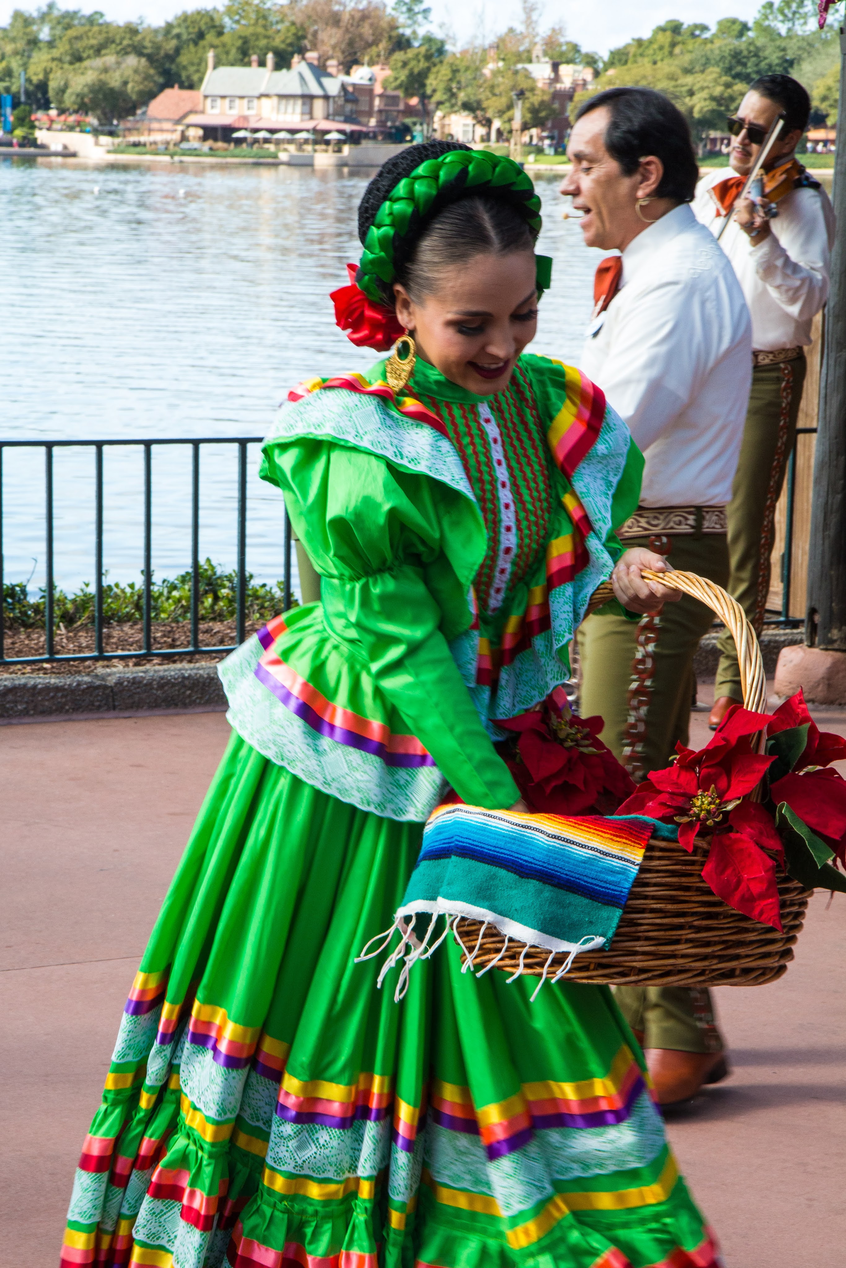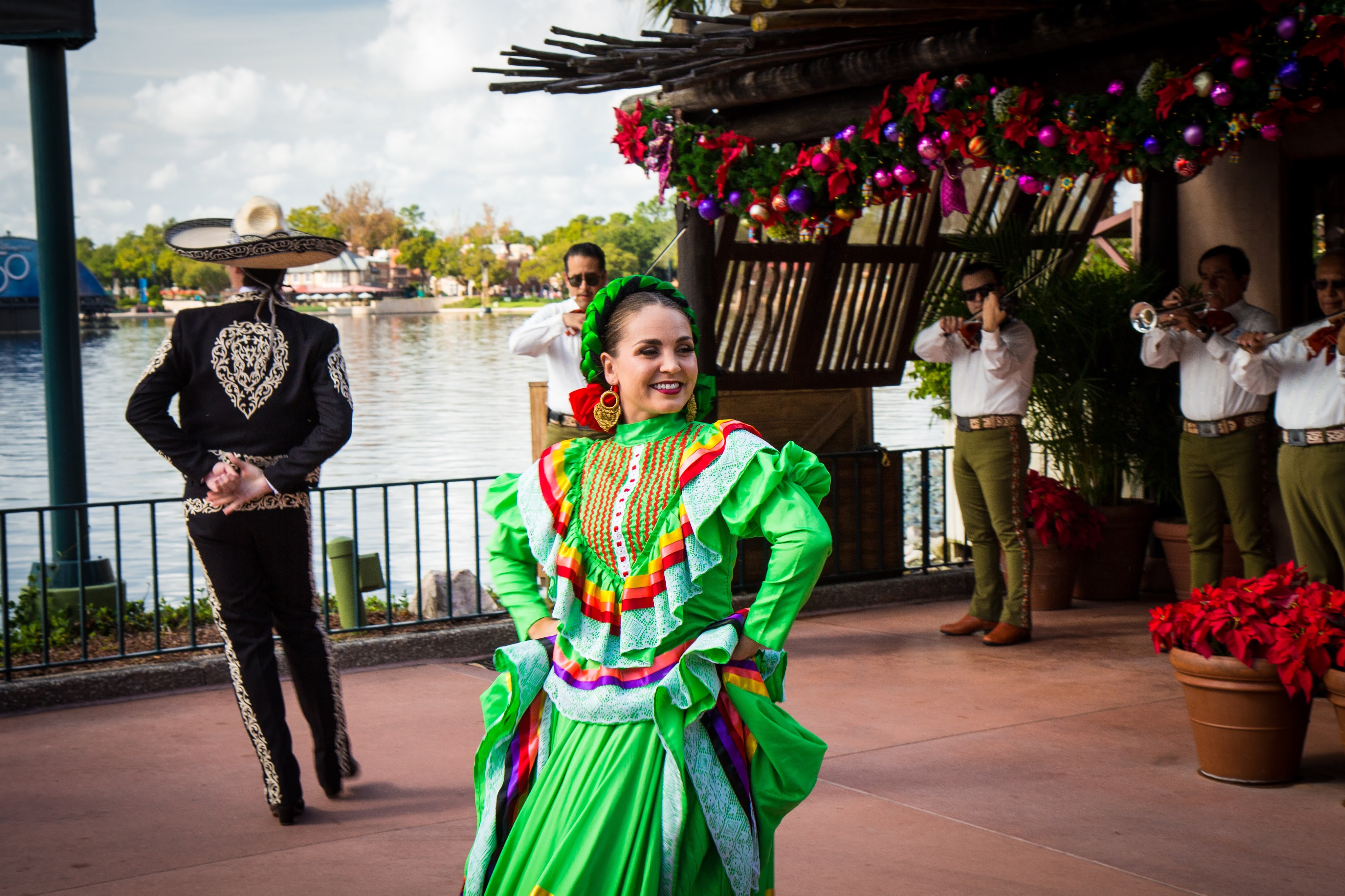 If you remember from Memory 268, we made our way from the front gate through the construction walled corridor and were approaching the World Showcase Promenade. We’ll join in as we are walking up to the Christmas Tree and admire the decorations before we turn left and enter into the Mexico Pavillion. As we approach the pyramid on our left, we begin to hear music that is definitely live. And as we continue forward just beyond La Hacienda de San Angel on our right, we stumble upon Mariachi Cobre playing and singing and sharing the story of Las Posadas in Mexico. We’ll stop, get a nice spot to watch (in the very warm sun), and enjoy their offerings. Mariachi Cobre is in the shade of the little market area, and these two amazing dancers dressed in colorful costumes move around in front and bring the stories and music to life. As the show is wrapping, and since this wasn’t in the plan, I’ll reoptimize my touring plan on the lines app again, and we’ll change our first attraction to something the kids have not done before. The good part is, we’ll get to enjoy some of the sounds of the promenade as we make our way towards our next destination to finish out our memory.