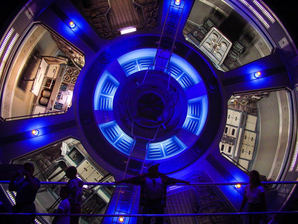 If you remember from Memory 276, we finally got to ride on Test Track after our longest wait of the day. As we exit the building, Mikey has been pointing out that over there is Mission: SPACE, and he’s dying to try the more intense Orange side for a while now. The Lines App by TouringPlans actually recommends Mission: SPACE next also, so that’s where we are headed I guess. It’s not a far walk, and we take a second to see if there is any way to visit the new SPACE 220 Restaurant that just opened, but unfortunately, they aren’t letting anyone in without a reservation at this point, it’s just too popular. So instead, we continue into the attraction, grabbing a card for the Orange, More Intense side. Shortly after catching up with the line inside the queue, they announce that the Orange side is having issues, so it’s pretty easy for us to say “let’s go ride Green instead”, where there is no line at all. We exit, switch cards with the Cast Members at the gate, and are immediately let in to ride, so that worked out well. In no time, we’ll be climbing into our cockpit and we are set for another fun trip around the Earth.