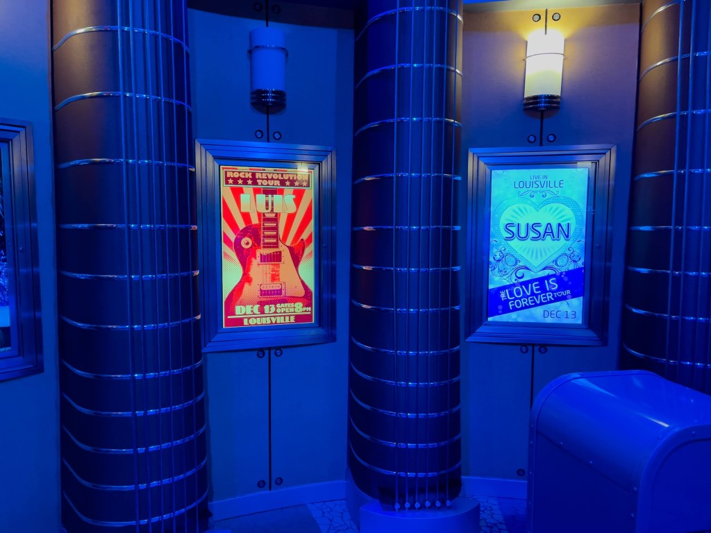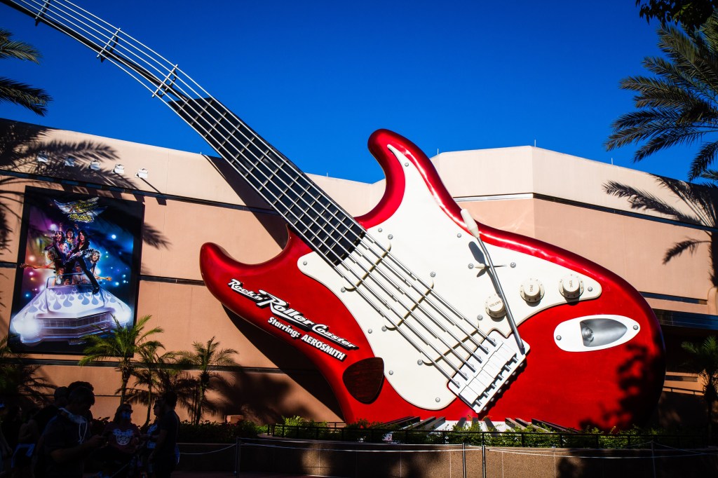If you remember in Memory 288, we wanted to get on Rock ‘n’ Roller Coaster, but it was still closed so we went back and hung out with Lightning McQueen and watched him train. Then as we exited the building, we could see the line was open for Rock ‘n’ Roller Coaster, so we quickly raced over and got in line. We’ll join the memory as we’re now in the queue and beginning the back-and-forth through the queue, enjoying the holiday music with a rock-n-roll flare. Soon we’re making our way up the ramp and into the G-Force Records studio, where we are surprised to see our names, and hometowns featured on the wall art in the front lobby. Then in no time we’re slipped into the back of the recording studio and see Aerosmith working with an audio engineer on mixing a track on their album before they (and us) are whisked away to get to the concert. We’ll head out back, where we hop in our Limo and tear off through the windy roads to try to make it to the concert. Once the ride is over, we’ll stop and get some water before we realize that the line is super short, and we’ll decide that if we want to do it again, we should try now, so we hop back in line and do it all over again. From here though, it’s time to get some lunch, so we place our mobile order for food at the ABC Commissary and begin heading up Sunset Boulevard, past the Brown Derby as we end this memory.