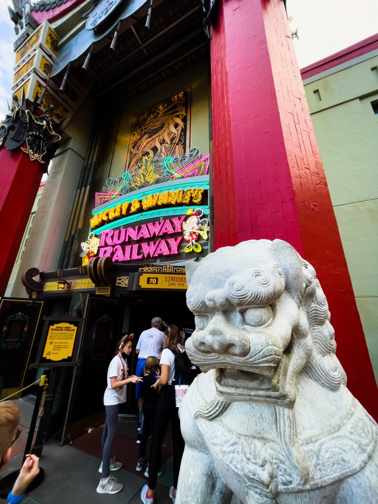 If you remember in Memory 293 (before our special Christmas memory), our family had just finished watching the Muppets and all their mayhem in 3D and were excited to try something new. We’ve made our way back towards the center of the park and as we join the memory we are in the queue as it wraps around the front of the Chinese Theater and about to enter inside where we’ll get to ride Mickey & Minnie’s Runaway Railway. The line is long and slow-moving but at least it’s not full sun outside. Soon we’re inside the building, but the air conditioning is not as strong as we would have hoped, so it isn’t as much relief. Every now and then though, you’ll hear us round a corner and stop in front of a vent that is blowing cool air, and we’ll enjoy it before moving on. Eventually, we’re shown into the screening room where we’re introduced to the new Mickey Mouse short before, well, things go a little wrong. Once we exit the ride, we realize we are nearing the end of our list of attractions we wanted to do, so we pick our next one on the list and head in that direction.