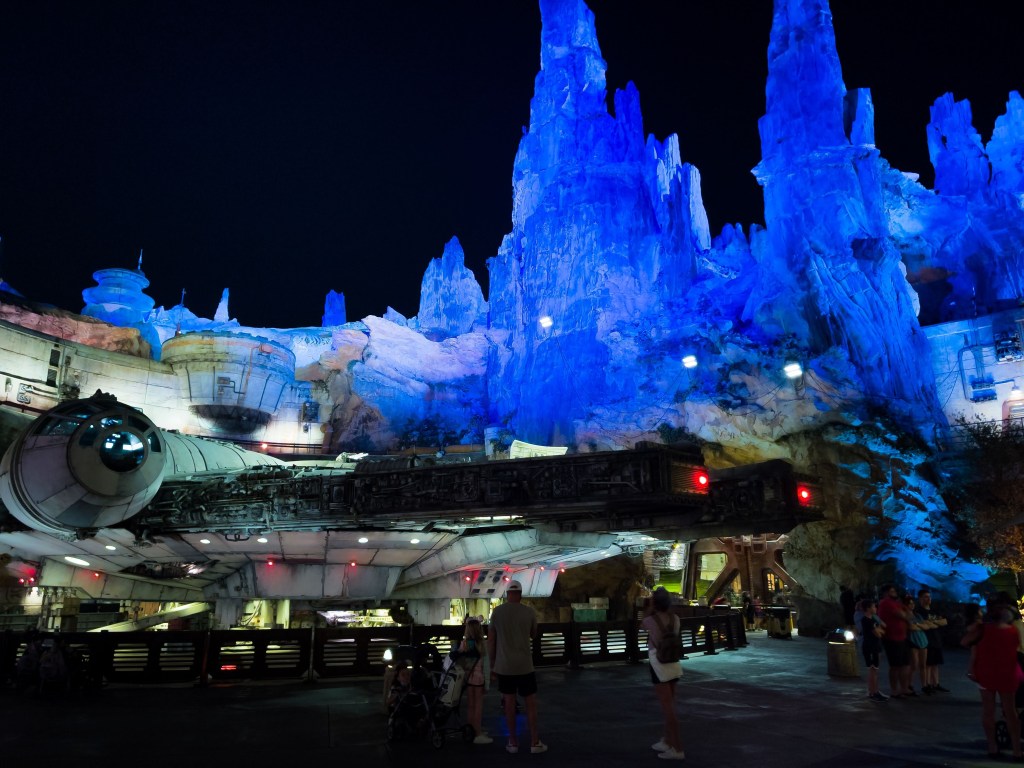 If you remember in Memory 296, my family had just finished finally getting to ride the new family-friendly coaster, Slinky Dog Dash. While we were waiting in line we placed a mobile order for Andy’s Lunchbox just around the corner, and the timing worked out almost perfectly for us to grab our food after we exited the ride. Our memory will pick up as we’ve just finished eating and are headed back into Batuu, at night, to finally catch a ride on the Millenium Falcon. The Millenium Falcon is absolutely gorgeous as she’s lit up with the spires rising above her, but we only pause for a moment as we get straight into the nonexistent line and walk all the way into where we get to hear from Hondo about our mission. That animatronic is so amazing and lifelike, but we are quickly ushered on into the next holding queue as we await our turn to pilot the ship. The time will pass quickly as we hear the fun ambient sounds of the ship that make you feel like we’re in an airport hanger. Finally, we’ll take our seats (Traci and Susie are pilots, Mikey and I are the gunners) and then we’re off. Try not to judge us, but we didn’t do too well, and as we exit the ship we can see how much the ship bore the brunt of our failed work. But I’m sure Hondo’s guys will have it back in working order the next time you go down.