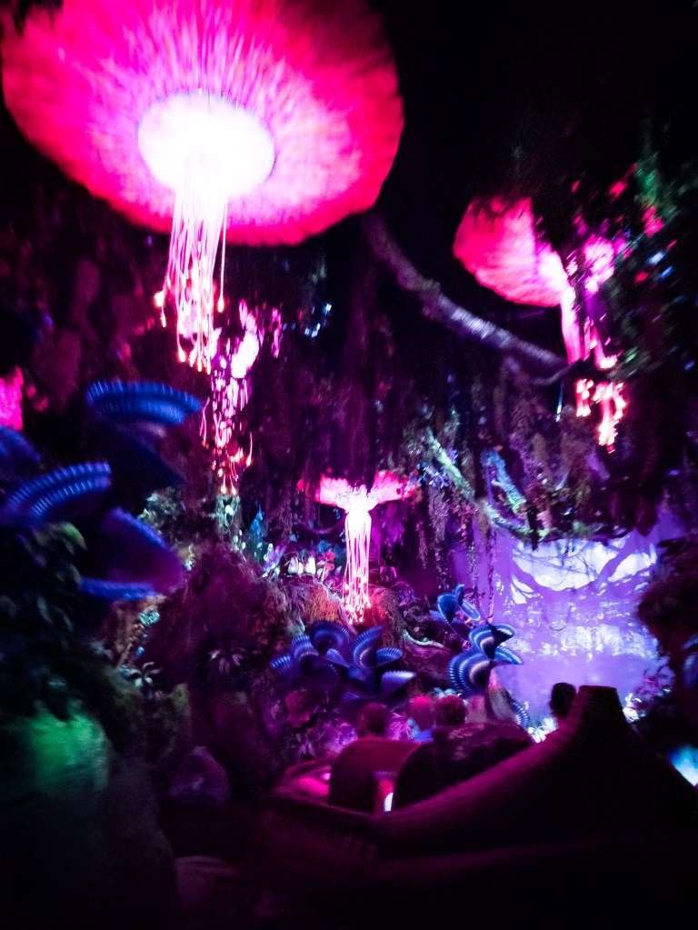We’ll join this memory as we just walked off our first ride on Avatar Flight of Passage, and we are giddy with excitement still as we are deciding on our next attraction. As we exit the gift shop, I’ve synced with the Touring Plans app, and it recommends we head to the River Journey. We ask a cast member, as it’s not obvious which way is the entrance to the attraction, and head over to get in line. The queue is covered by a thatched roof-like structure, with descriptions of the plants, and of the artifacts and culture of the Na’vi scattered around. I didn’t remember though, the sounds in the queue being so amazing, you’ll hear animals nearby, but never quite in sight. Listen as they run and call to one another, and even stampede a little bit. But the line moves quickly, and in a few minutes, we’ll be ready to board our little boat, they do fit 4 across, so I guess it’s not that little. Once inside, the boat quickly enters the water, and we’re off into the world of the Na’vi. The plants are vibrant and glowing, the animals walk nearby, and there are even a few Na’vi people there to talk to you or greet you. They do great things with scrims and projections to give you the feeling of depth and dimensionality, and you swear that the dear-like animal is right there. As you round the final bend, and the shaman is there, you finally see that amazing animatronic that is the next level of natural-looking art. The way she moves, sings, and acts is just so life-like, it’s awesome. This is not the most exciting attraction, but listening back I don’t think I gave it the credit it deserved. It is such an immersive experience that it really put you in the world of Avatar so much more than Flight of Passage does. I only wish it was longer. Once we exit though, the question is, what do we do next?