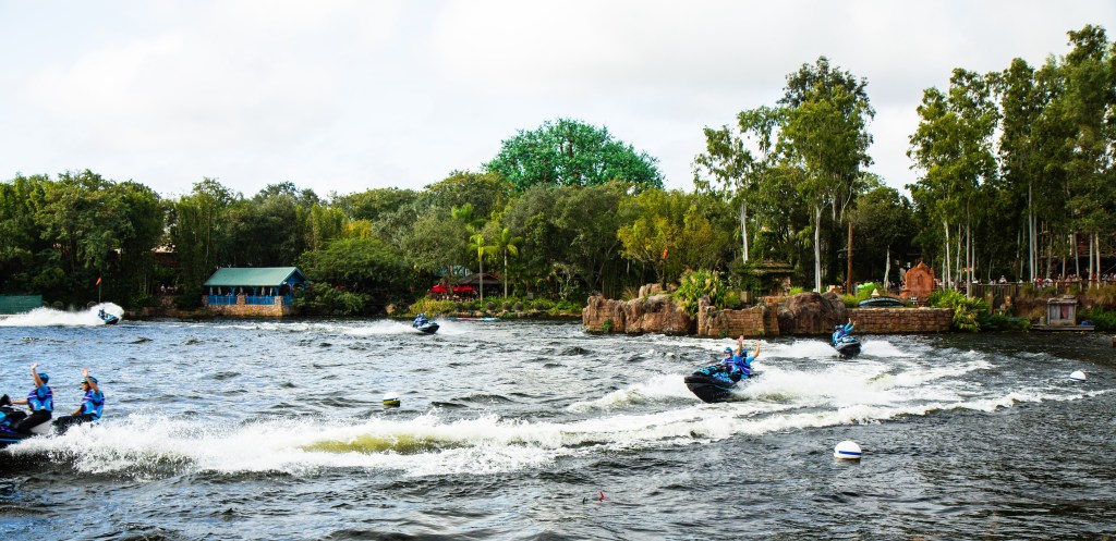Today’s memory takes us back to a Tuesday morning in December 2021. Our visit to the Maharaja Jungle Trek was brief, but remember we were using it to pass the time before KiteTails started. Now it’s time to find seats, so we’ll exit the trail and head right towards the crowds gathering at the Discovery River lagoon for the next KiteTails show.