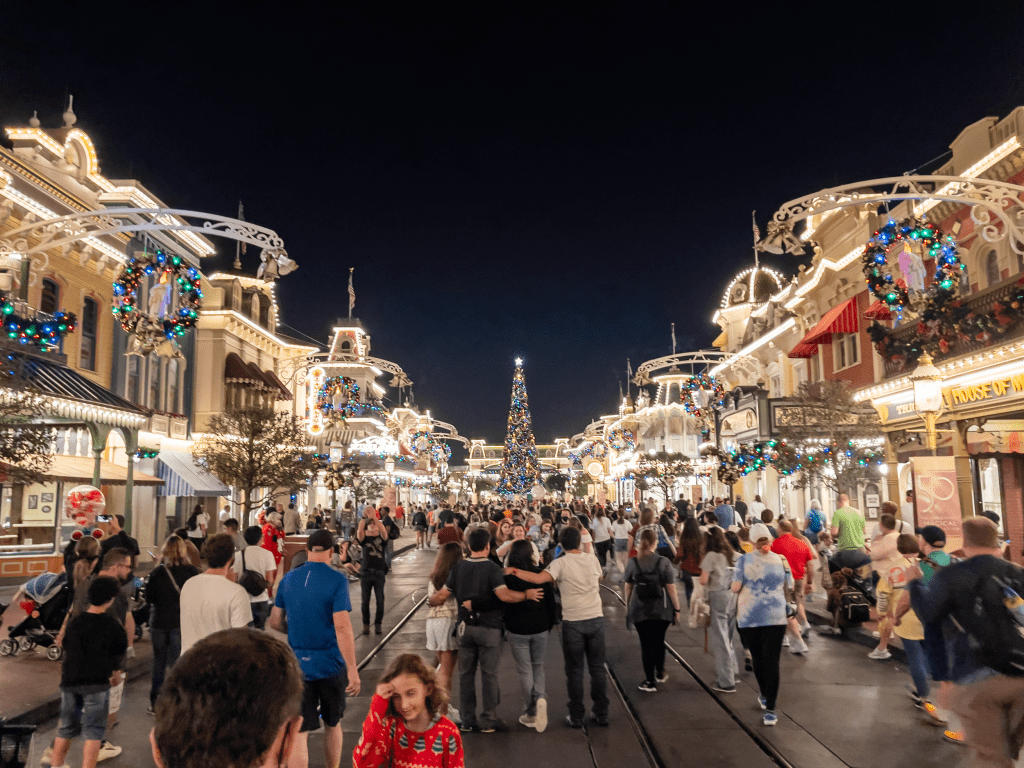 We’ll join today’s memory as we are heading back to Main Street USA, taking a few pics of the castle all decked out for Christmas. Then, we’ll stroll right down the middle of Main Street, admiring the gorgeous decorations on all the buildings. We’ll stop by the Christmas Tree in the center of Town Square, before making our way under the train trestle, and now we have to decide whether to wait for the monorail or take the ferry. We choose the ferry, which is just arriving, instead of the long line for the monorail. We hop on, find a seat, and enjoy the music as we cruise across the Seven Seas Lagoon. We’ll listen along as we make our way through the TTC, and then we’ll head to the parking lot to find our car.